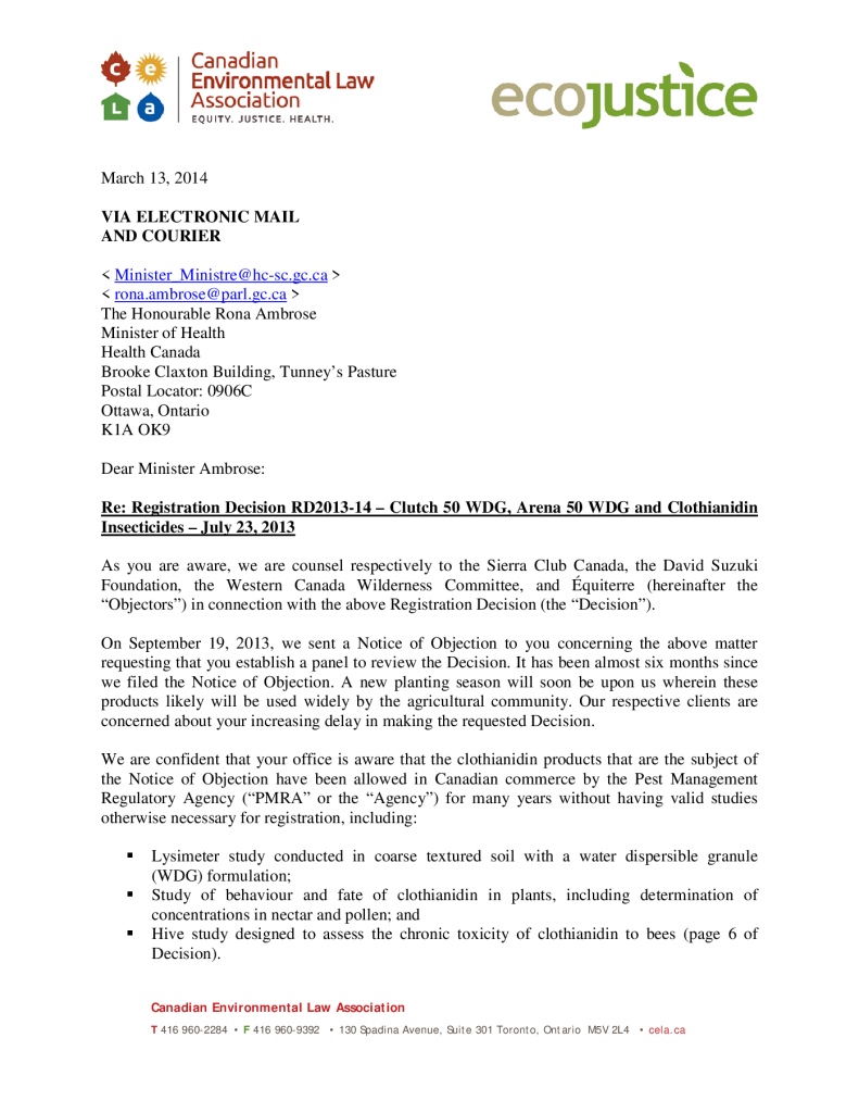 Re: Registration Decision RD2013-14 – Clutch 50 WDG, Arena 50 WDG and Clothianidin Insecticides – July 23, 2013 Follow-up Letter to Health Minister Rona Ambrose from CELA and Ecojustice on behalf of Sierra Club Canada Foundation, David Suzuki Foundation, Wilderness Committee, and Équiterre