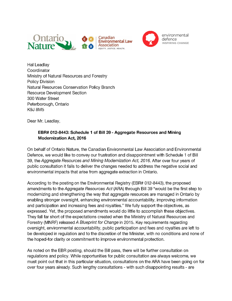 Re: Schedule 1 of Bill 39 – Aggregate Resources and Mining Modernization Act, 2016