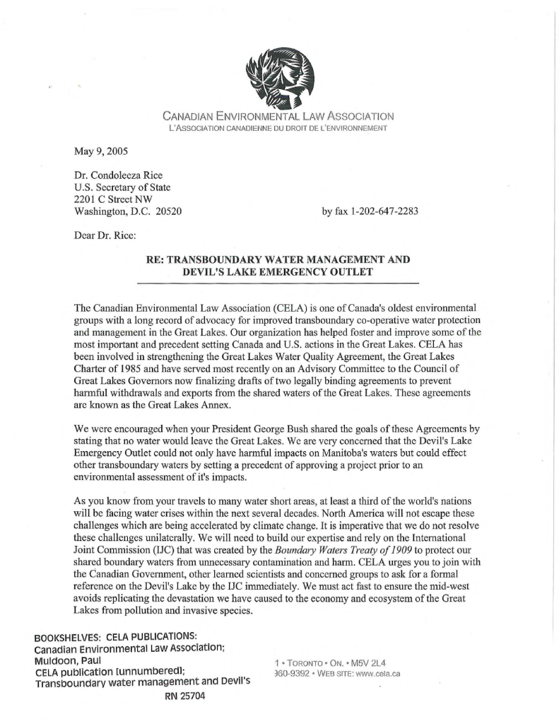 Re : transboundry water management and Devil’s Lake emergency outlet