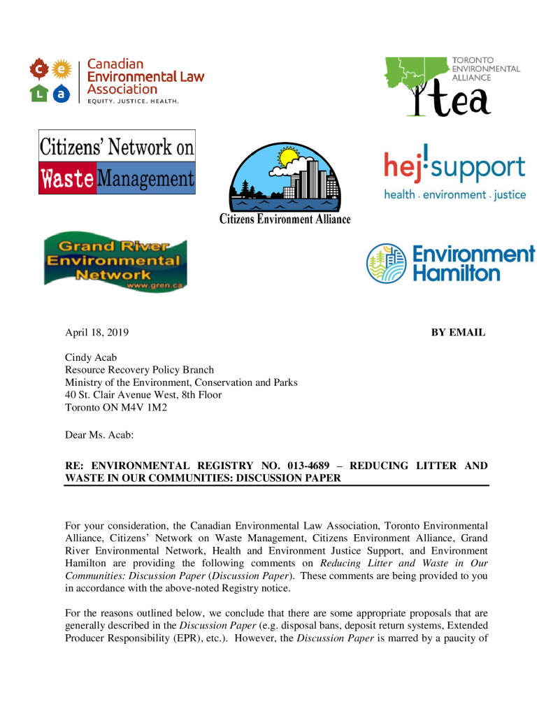 Reducing Litter and Waste in Our Communities: Discussion Paper. Response to Environmental Registry No. 013-4689