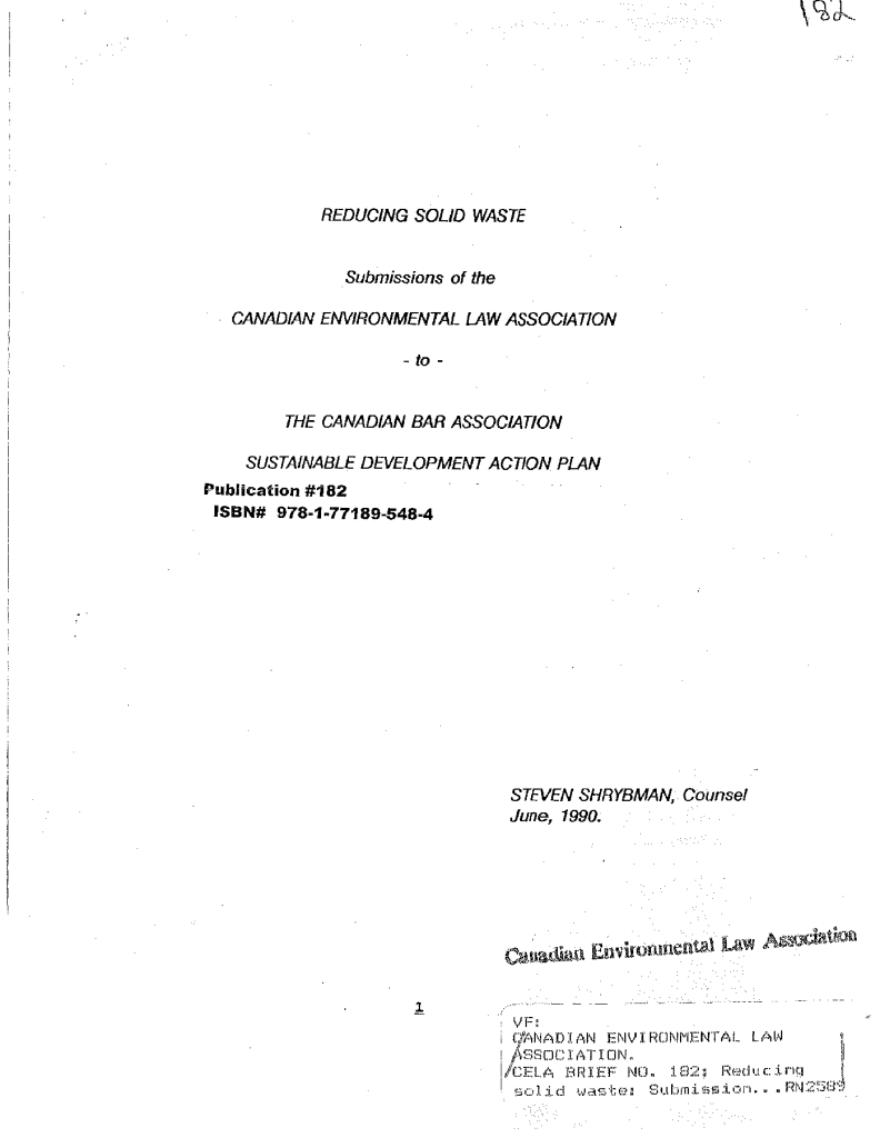 Reducing solid waste: Submissions of the Canadian Environmental Law Association to the Canadian Bar Association Sustainable Development Action Plan