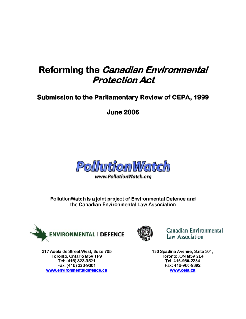 Reforming the Canadian Environmental Protection Act: Submission to the Parliamentary review of CEPA, 1999