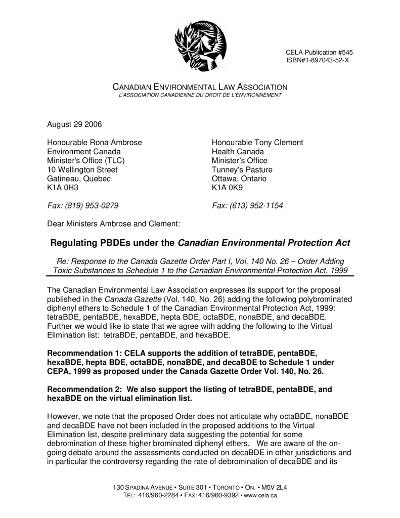 Regulating PBDEs under the Canadian Environmental Protection Act. Re: Response to the Canada Gazette Order Part I, Vol. 140 No. 26, Order adding toxic substances to Schedule 1 to the Canadian Environmental Protection Act, 1999