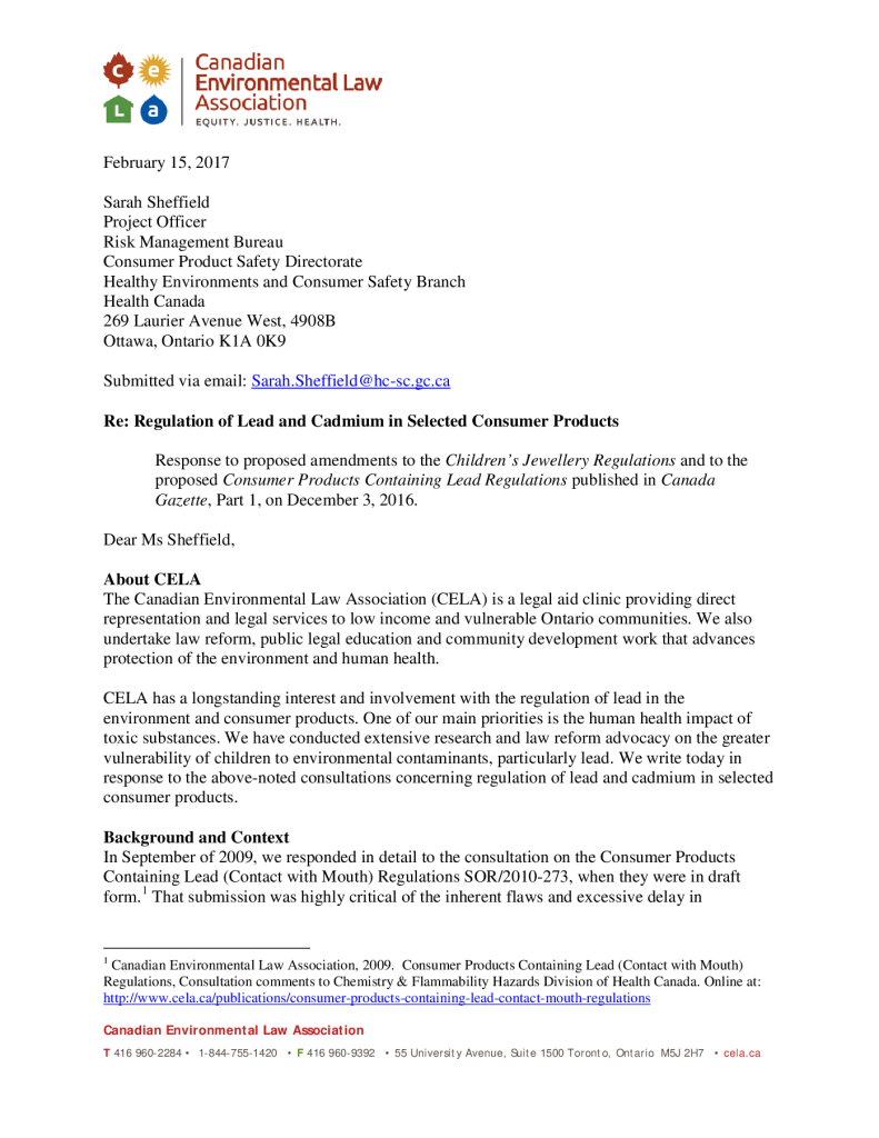 Regulation of Lead and Cadmium in Selected Consumer Products