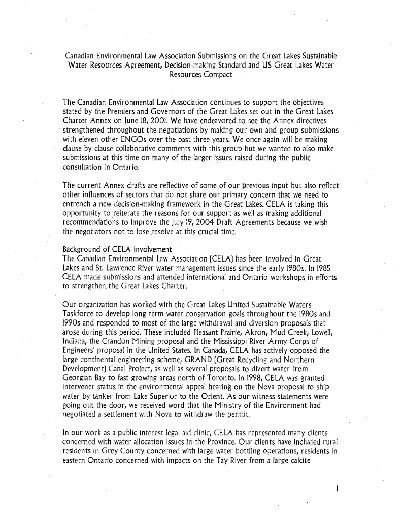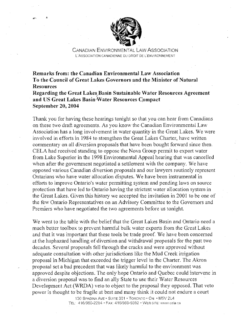Remarks from Canadian Environmental Law Association regarding the Great Lakes Basin sustainable water resources