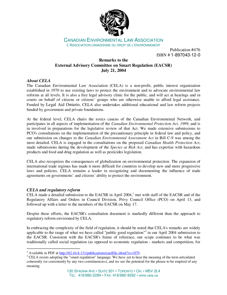 File 1.0 - CELA briefs and responses to government consultations environmental justice