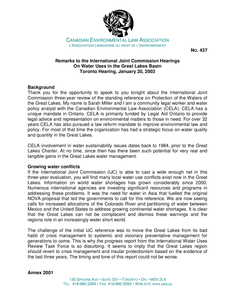 Remarks to the International Joint Commission hearings on water uses in the Great Lakes Basin