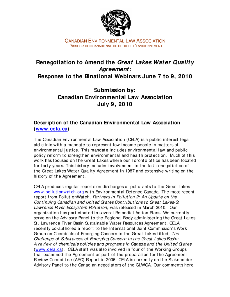 Renegotiation to amend the Great Lakes Water Quality Agreement: response to the Binational webinars June 7-9, 2010