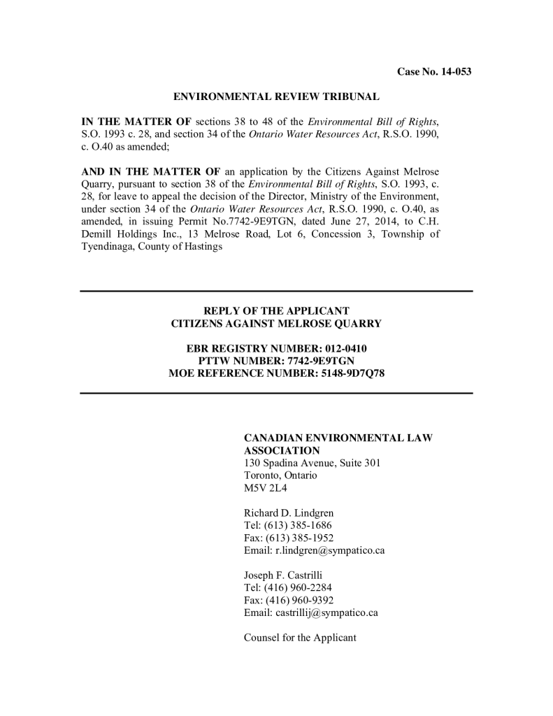 Reply Of The Applicant Citizens Against Melrose Quarry