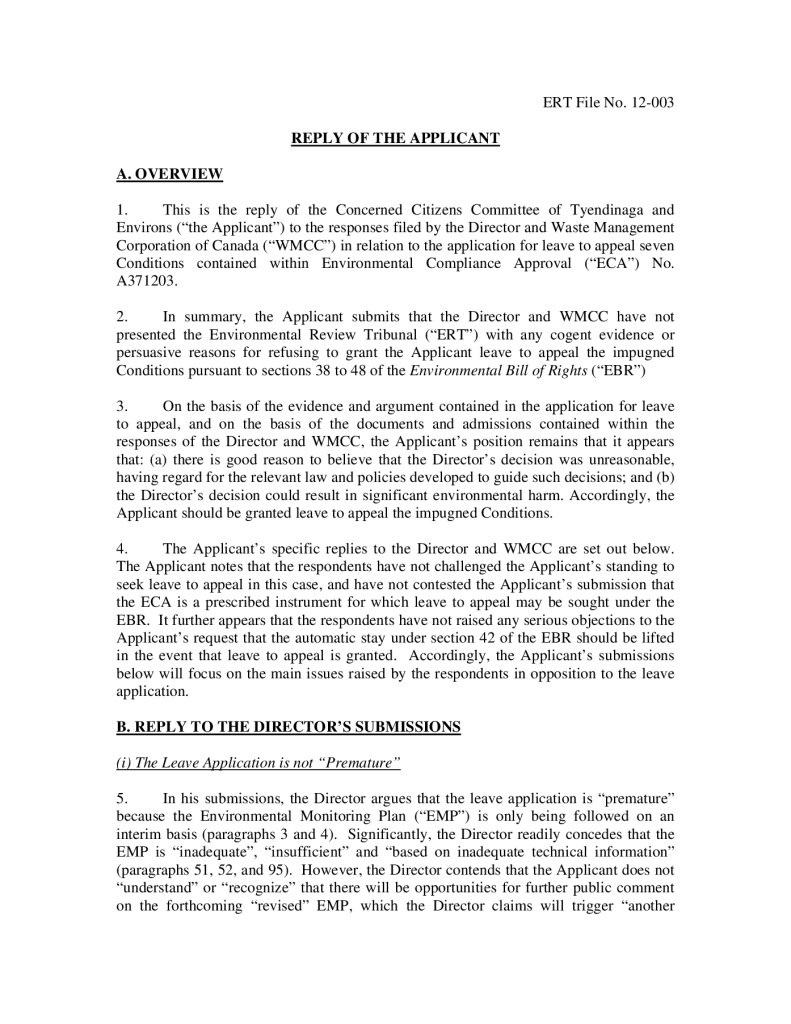 Reply of the Applicant – ERT CCCTE v. Director, Ministry of the Environment (Case no. 12-003)