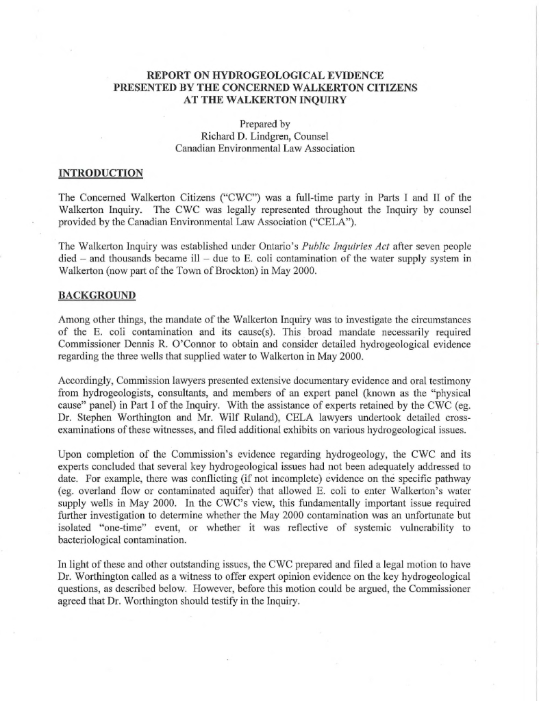 Report of the hydrogeological evidence presented by the concerned Walkerton citizens at the Walkerton inquiry