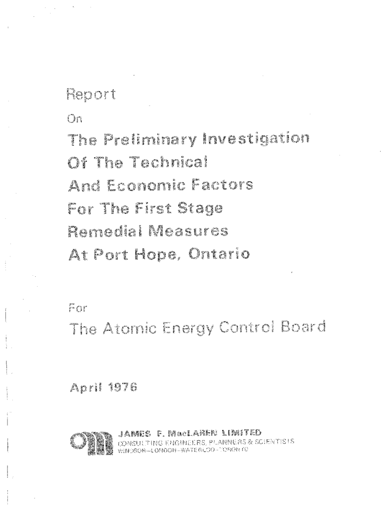Report on the preliminary investigation of the technical and economic factors for the first stage remedial measures at Port Hope, Ontario