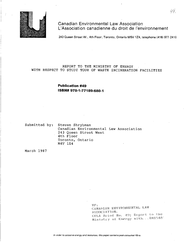 Report to the Ministry of Energy with respect to study tour of waster incineration facilities
