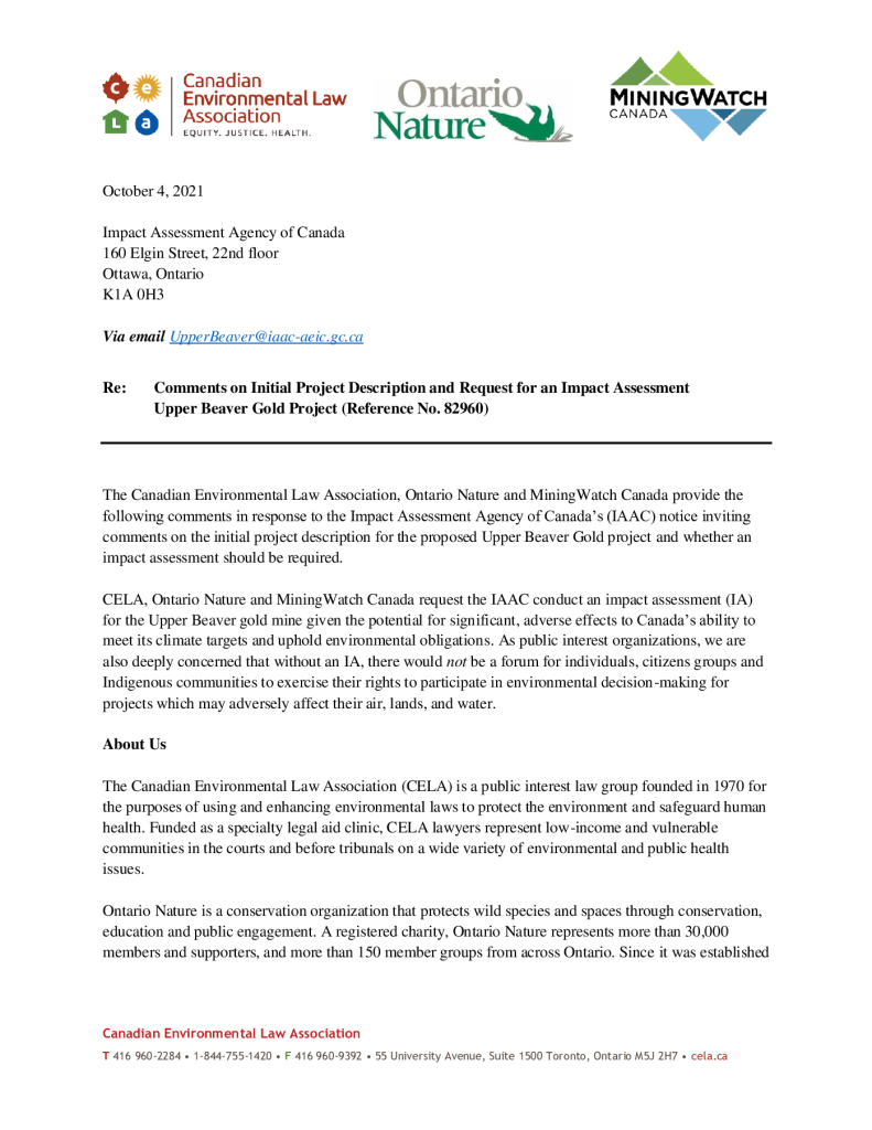 Request for an Impact Assessment for the Upper Beaver gold mine