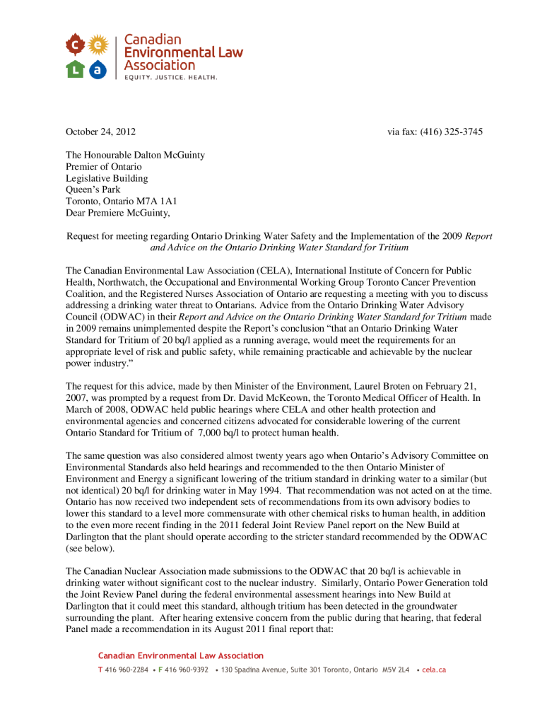 Request for meeting regarding Ontario Drinking Water Safety and the Implementation of the 2009 Report and Advice on the Ontario Drinking Water Standard for Tritium