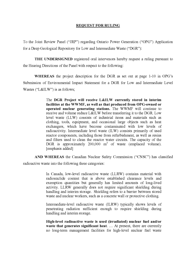 Request for Ruling Regarding Clarification About High Level Waste (DGR)