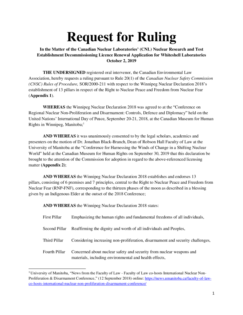Request for Ruling to CNCS – Adoption of Winnipeg Declaration