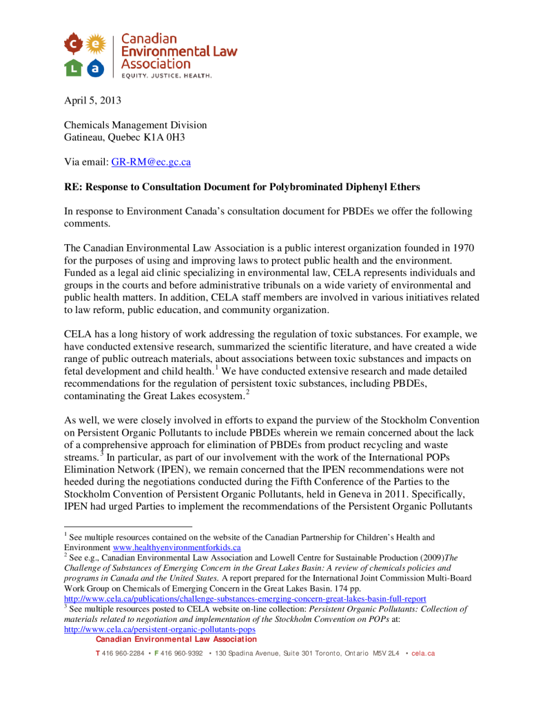 Response to Consultation Document for Polybrominated Diphenyl Ethers