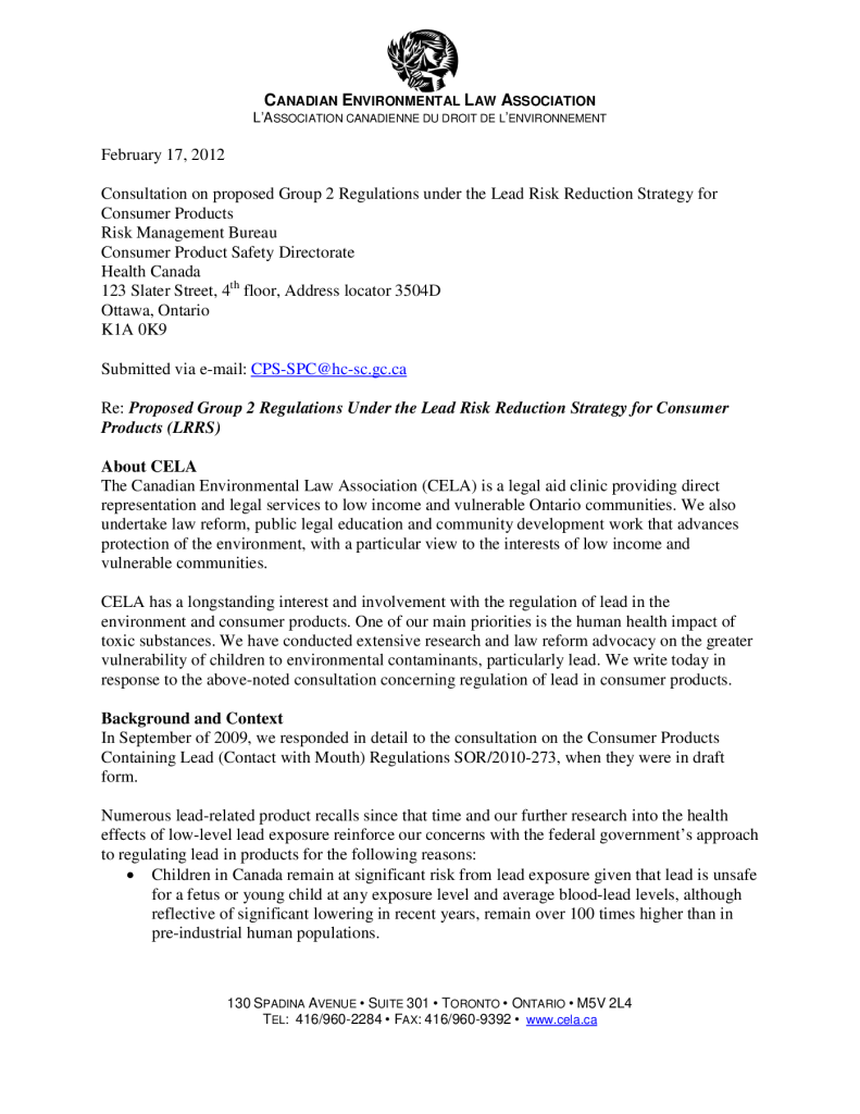Response to Proposed Group 2 Regulations Under the Lead Risk Reduction Strategy for Consumer Products (LRRS)