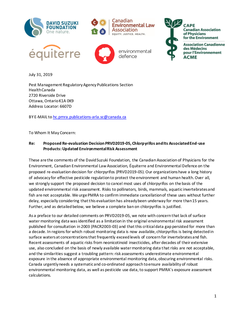 Response to Proposed Re-evaluation Decision PRVD2019-05, Chlorpyrifos and Its Associated End-use Products: Updated Environmental Risk Assessment