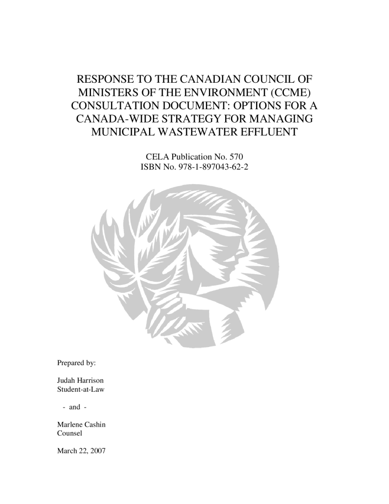 Response to the Canadian Council of ministers of the Environment (CCME) consultation document: Options for a Canada-wide strategy for managing municipal wastewater effluent