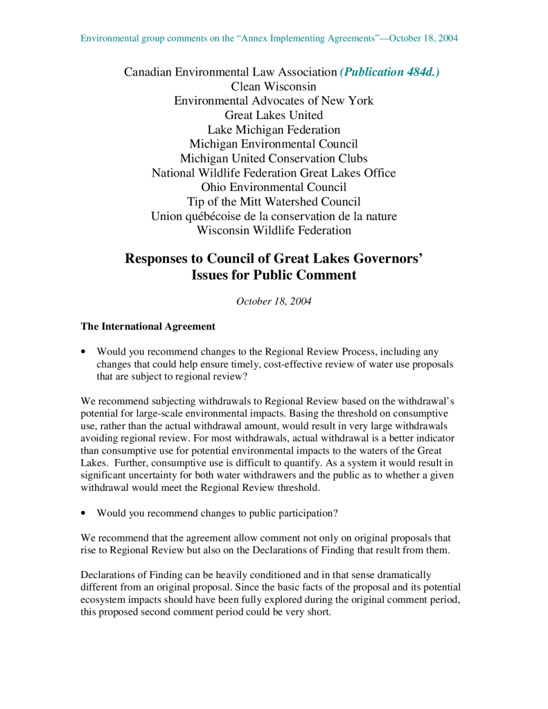 Responses to Council of Great Lakes Governors’ Issues for Public Comment