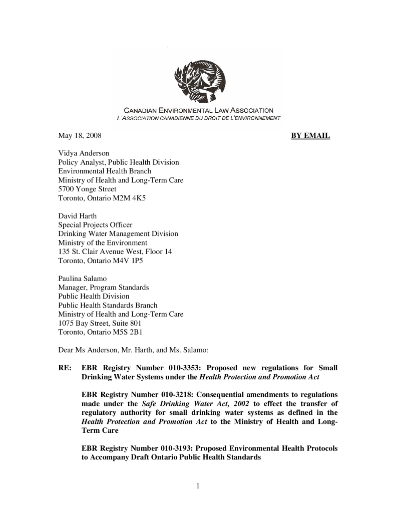 Responses to regulatory proposals for small drinking water systems and proposed environmental health protocols to accompany draft Ontario public health standards