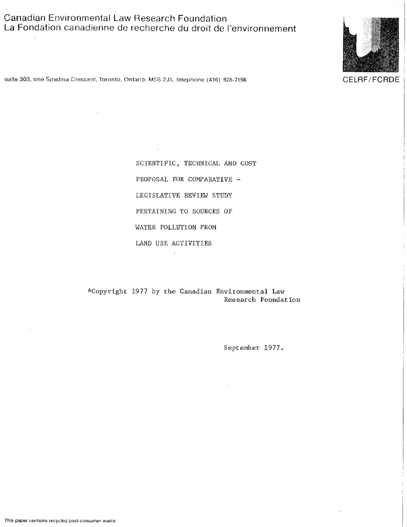 Scientific, technical and cost proposal for comparative – legislative review study pertaining to sources of water pollution from land us activities