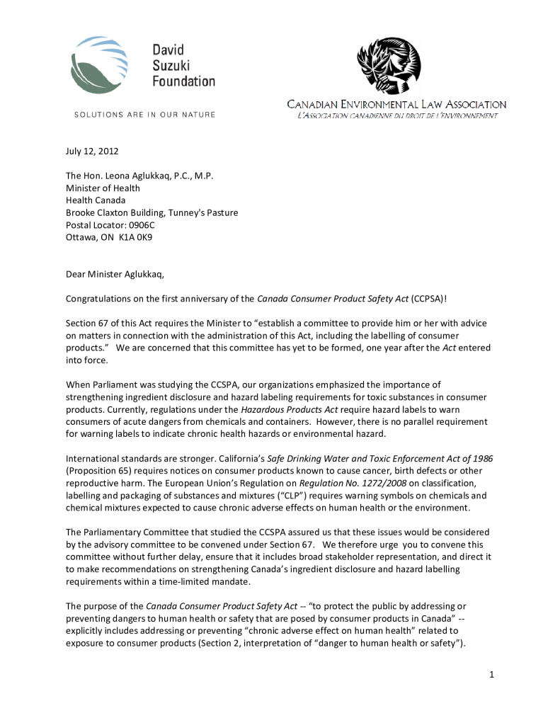 Section 67 of Canada Consumer Product Safety Act – Advisory Committee on Administration Including Product Labelling