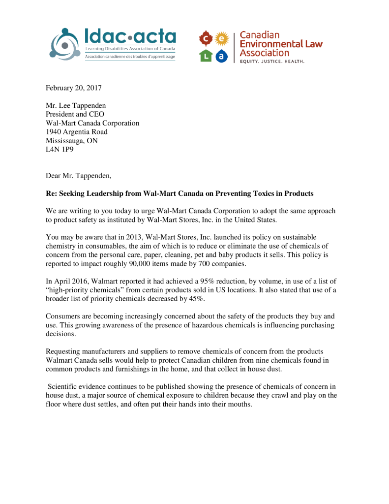 Seeking Leadership from Wal-Mart Canada on Preventing Toxics in Products
