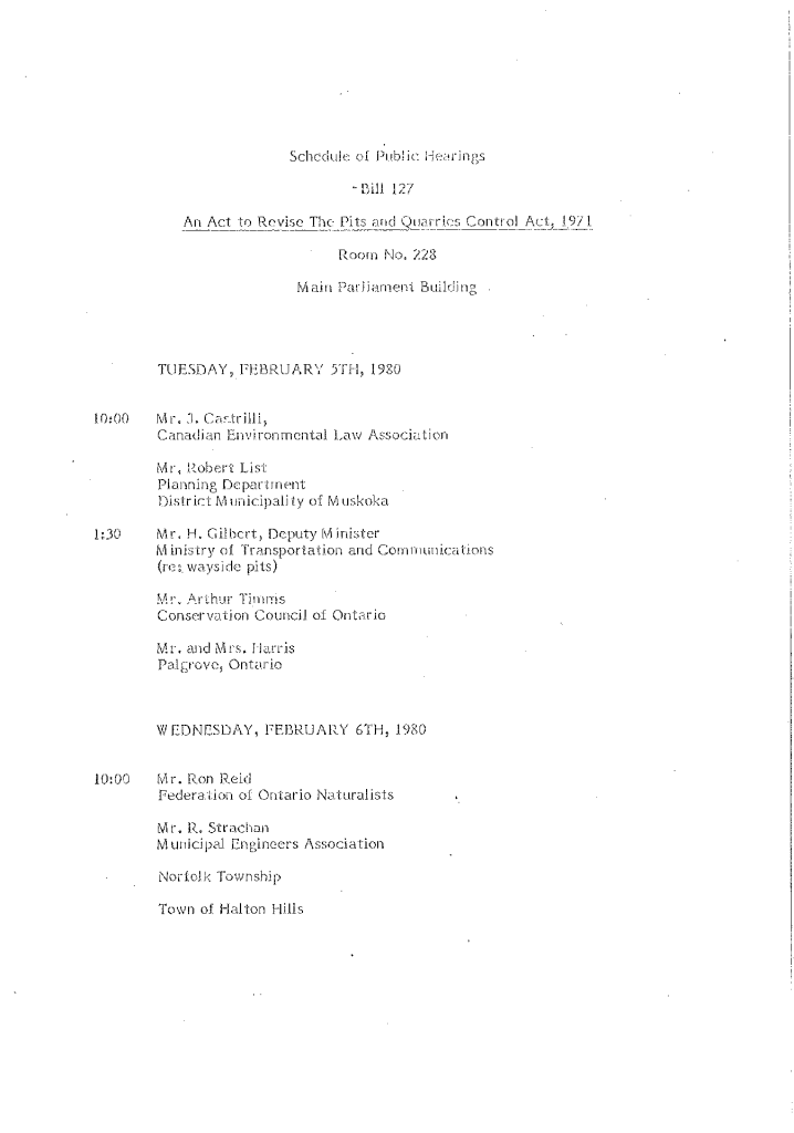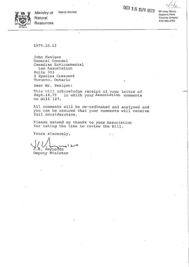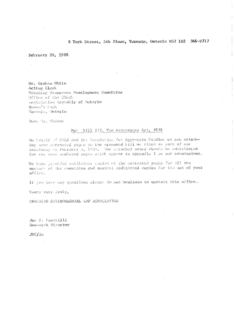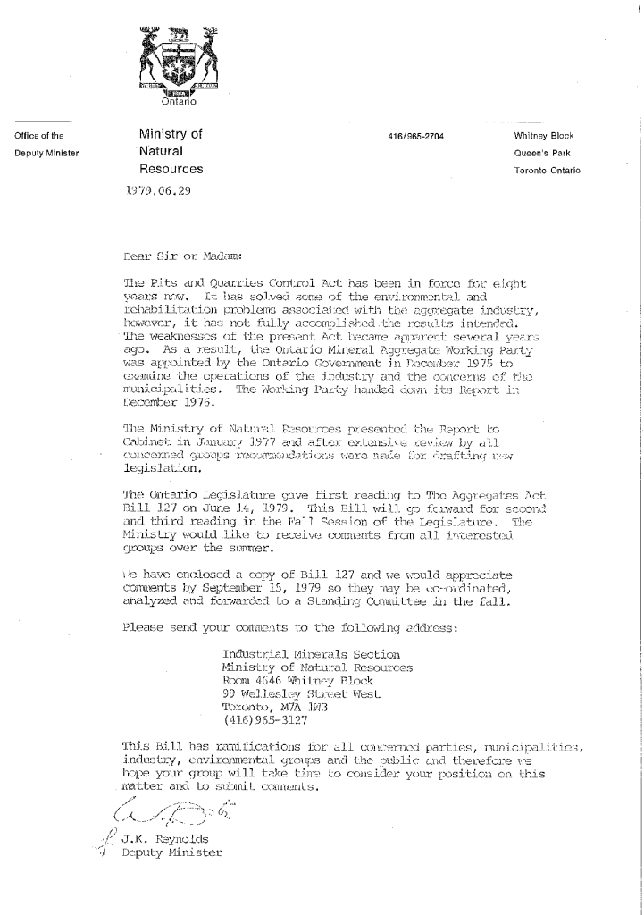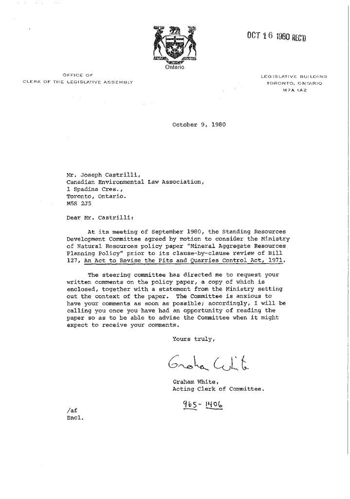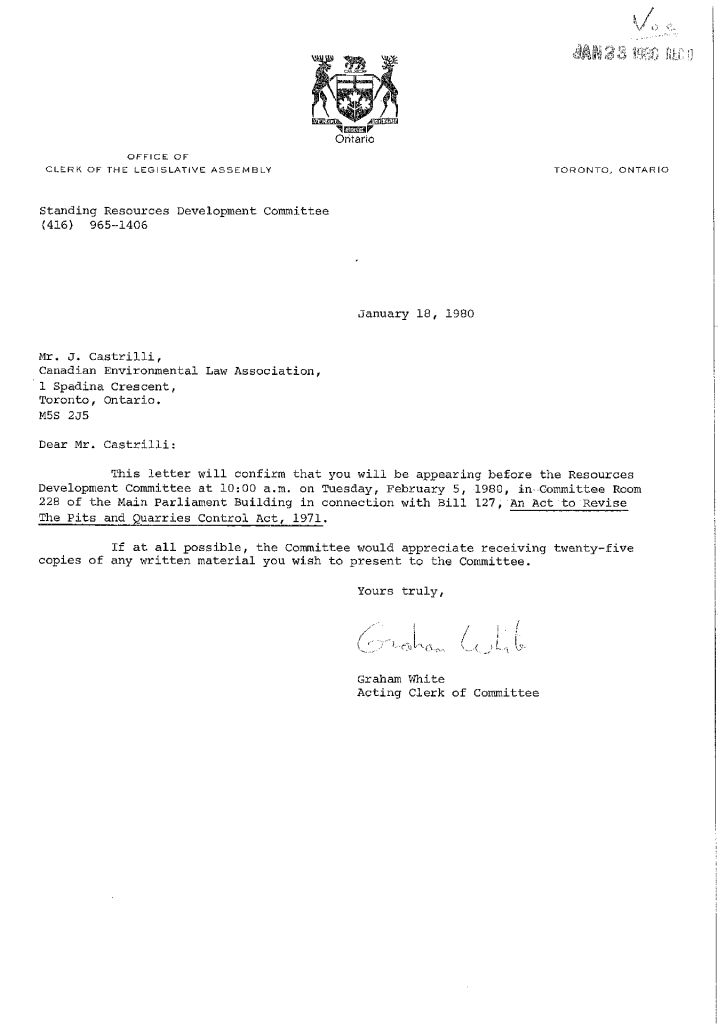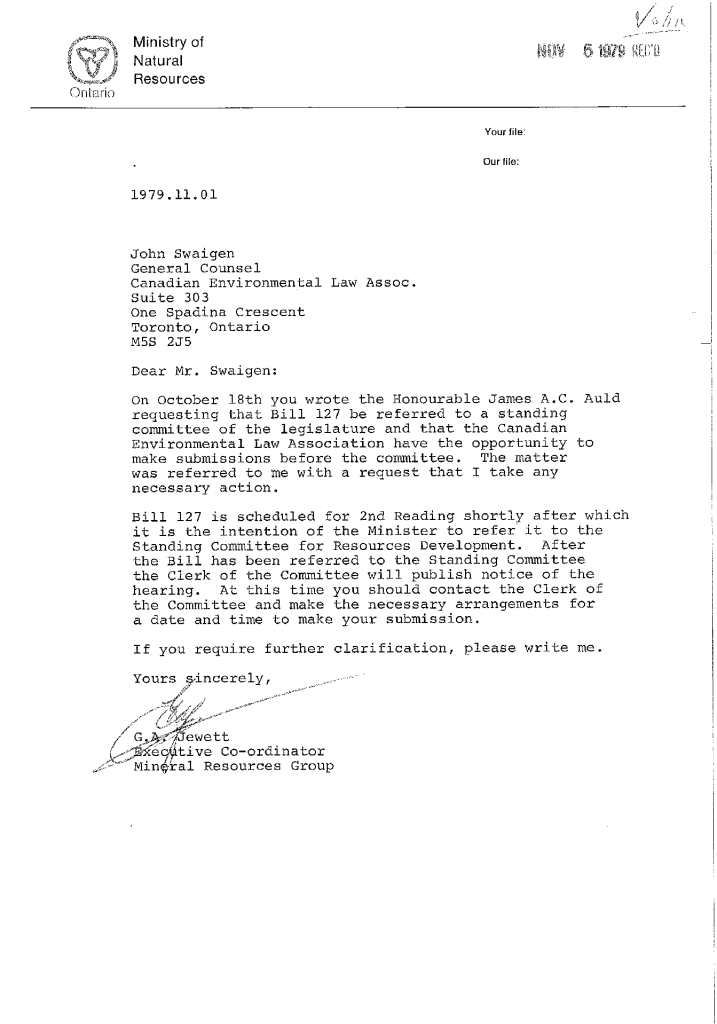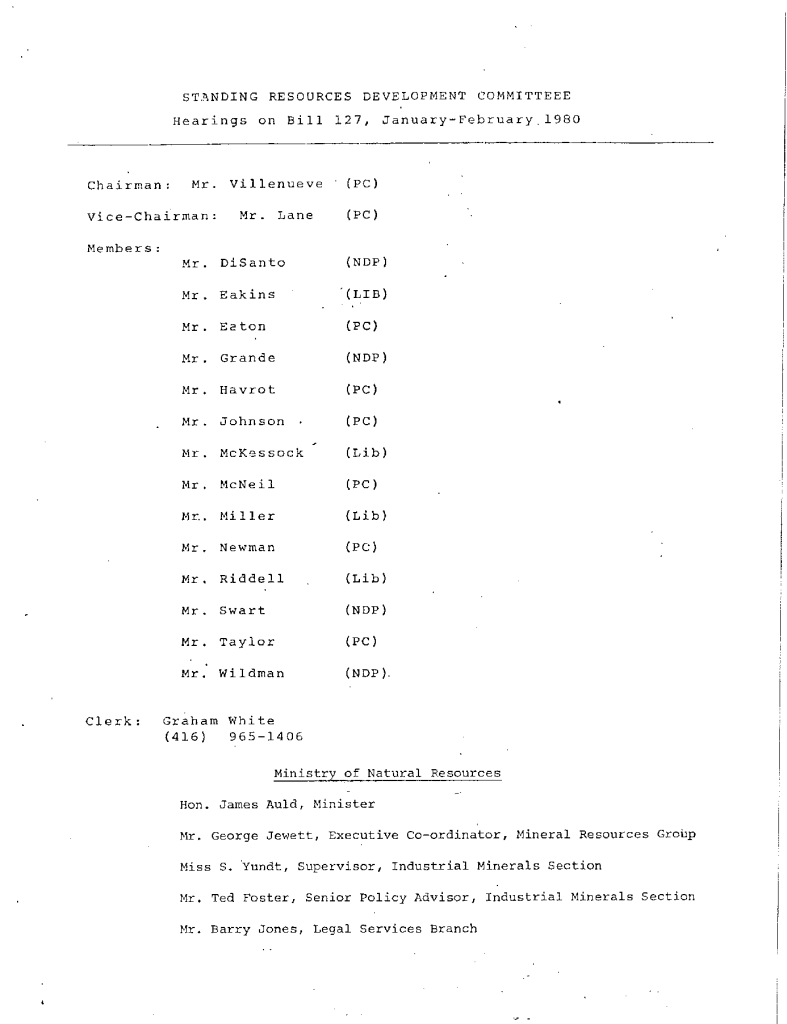 Selected correspondences from clerk of resource development standing committee – Bill 127