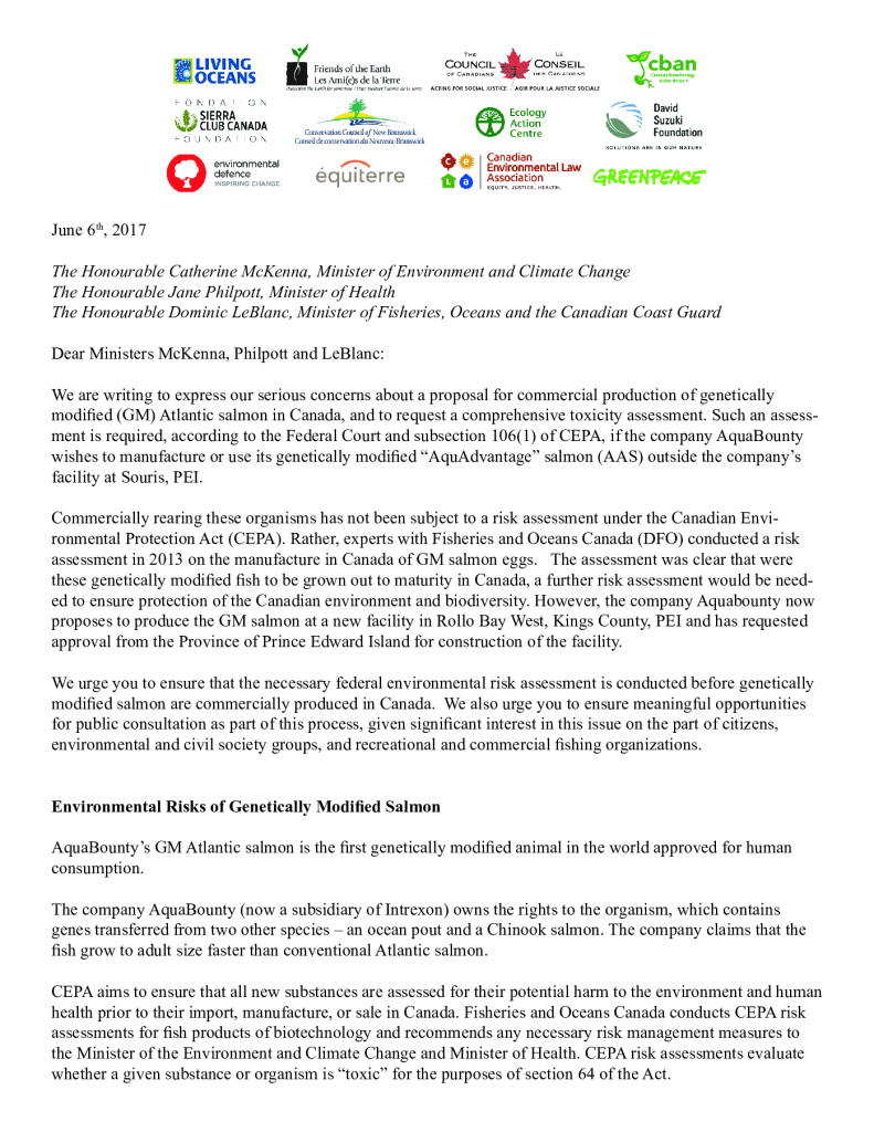 Serious Concerns re Proposal for Commercial Production of Genetically Modified (GM) Atlantic Salmon in Canada