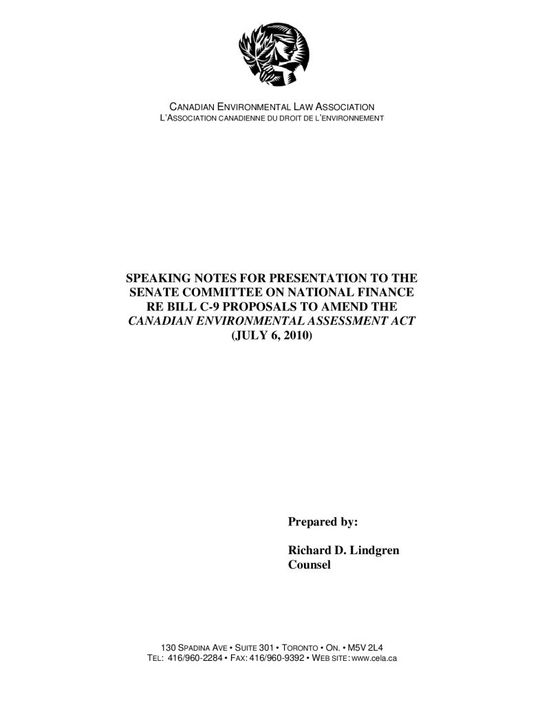 Speaking notes for presentation to the Senate Committee on National Finance re: Bill C-9 proposals to amend the Canadian Environmental Assessment Act (July 6, 2010)