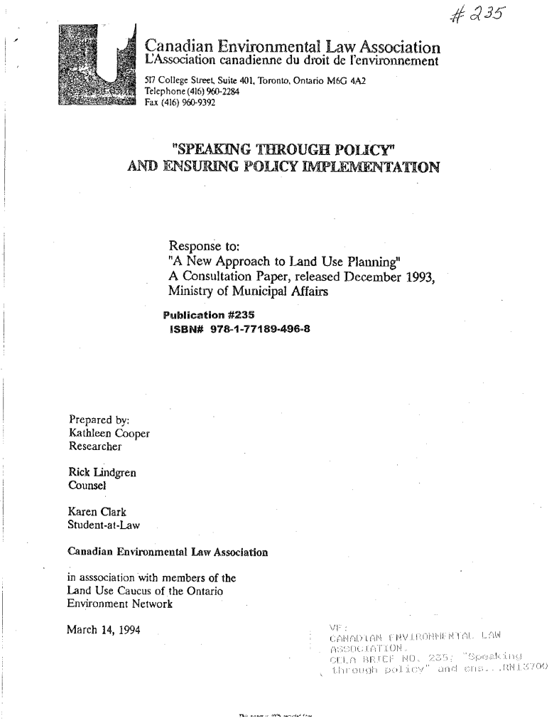 “Speaking through policy” and ensuring policy implementation: Response to “A New Approach to Land Use Planning” a consultation paper released December 1993, Ministry of Municipal Affairs