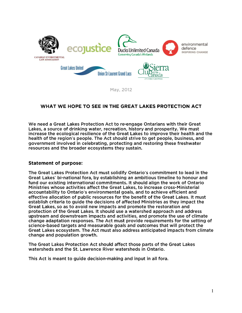 Statement of Expectations on the Great Lakes Protection Act and Legislative Drafting Notes