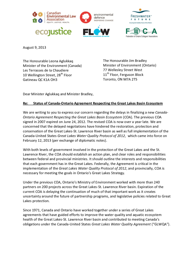 Status of Canada-Ontario Agreement Respecting the Great Lakes Basin Ecosystem