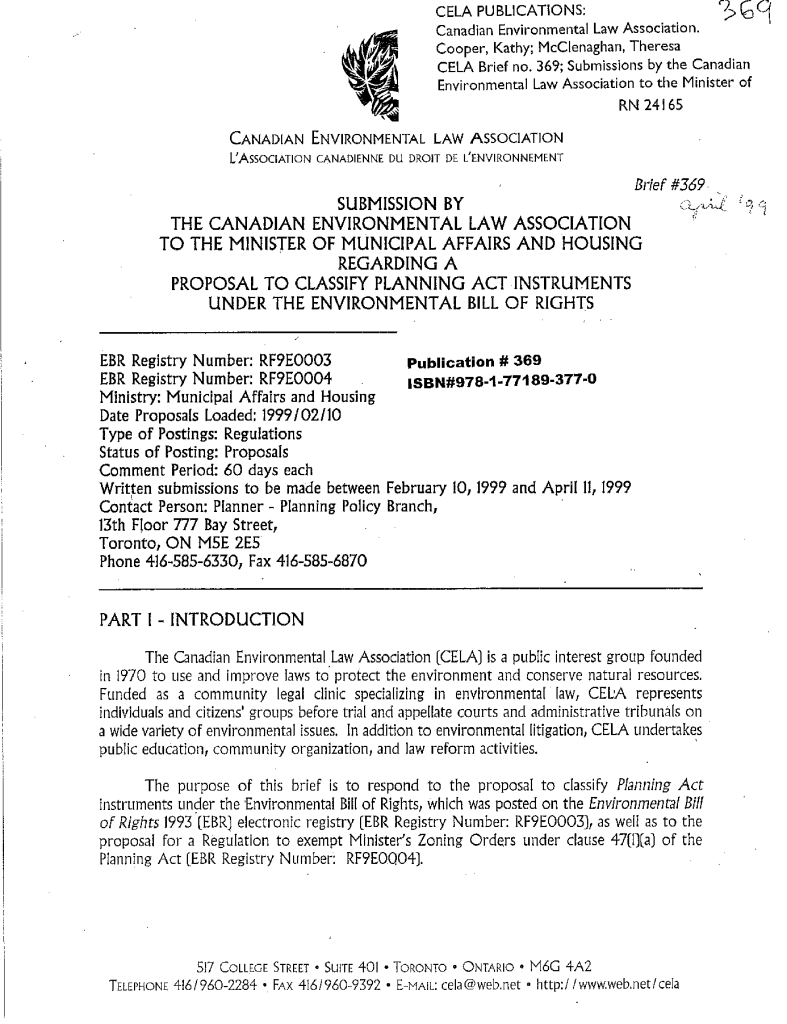 Submission by the Canadian Environmental Law Association to the Minister of Municipal Affairs and Housing regarding a proposal to classify planning act instruments under the Environmental Bill of Rights