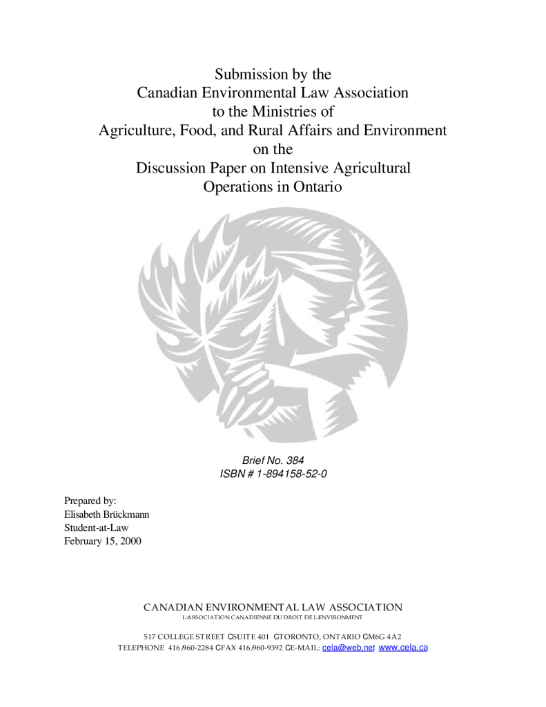 Submission by the Canadian Environmental Law Association to the Ministries of Agriculture, Food, and Rural Affairs and Environment on the discussion paper on intensive agricultural operations in Ontario