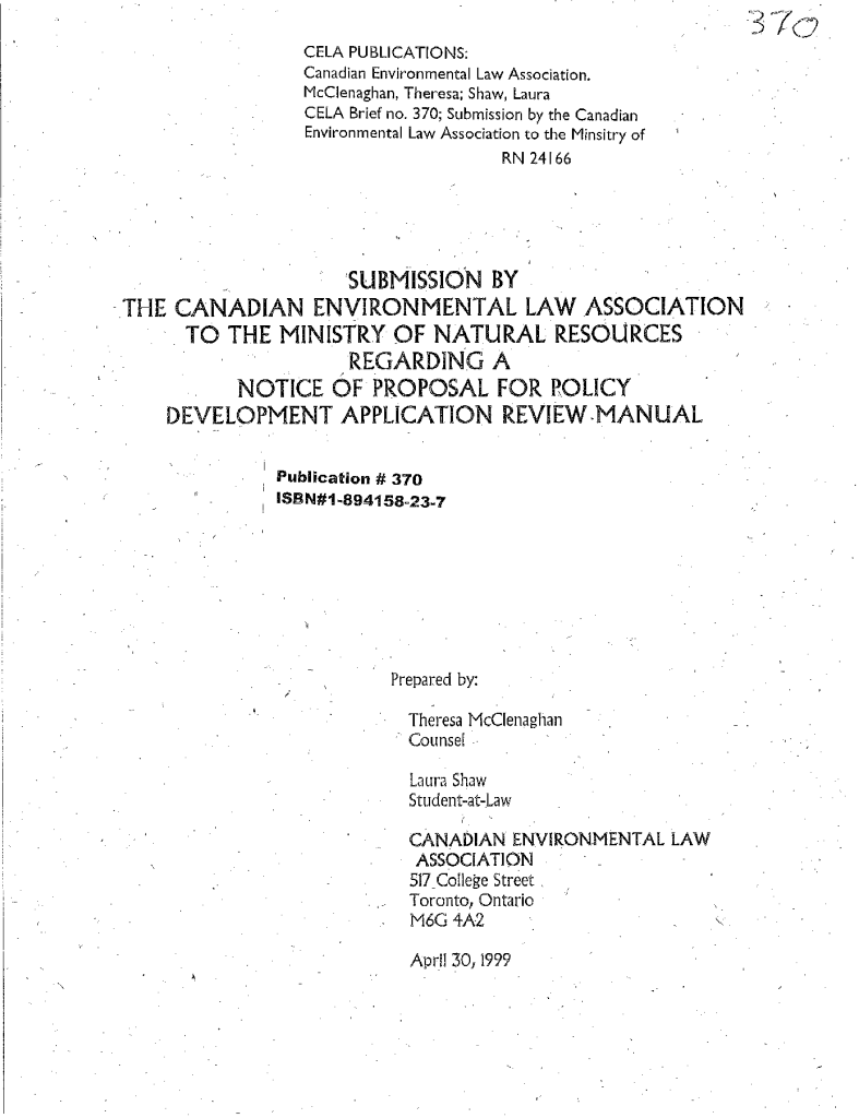 Submission by the Canadian Environmental Law Association to the Ministry of Natural Resources regarding a notice of proposal for policy development application review manual