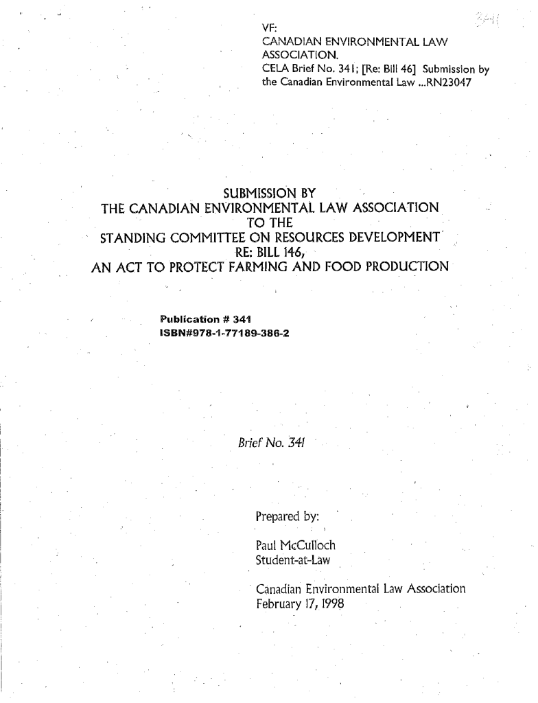 Submission by the Canadian Environmental law Association to the Standing Committee on Resources Development re: Bill 146, An Act to Protect Farming and Food Production