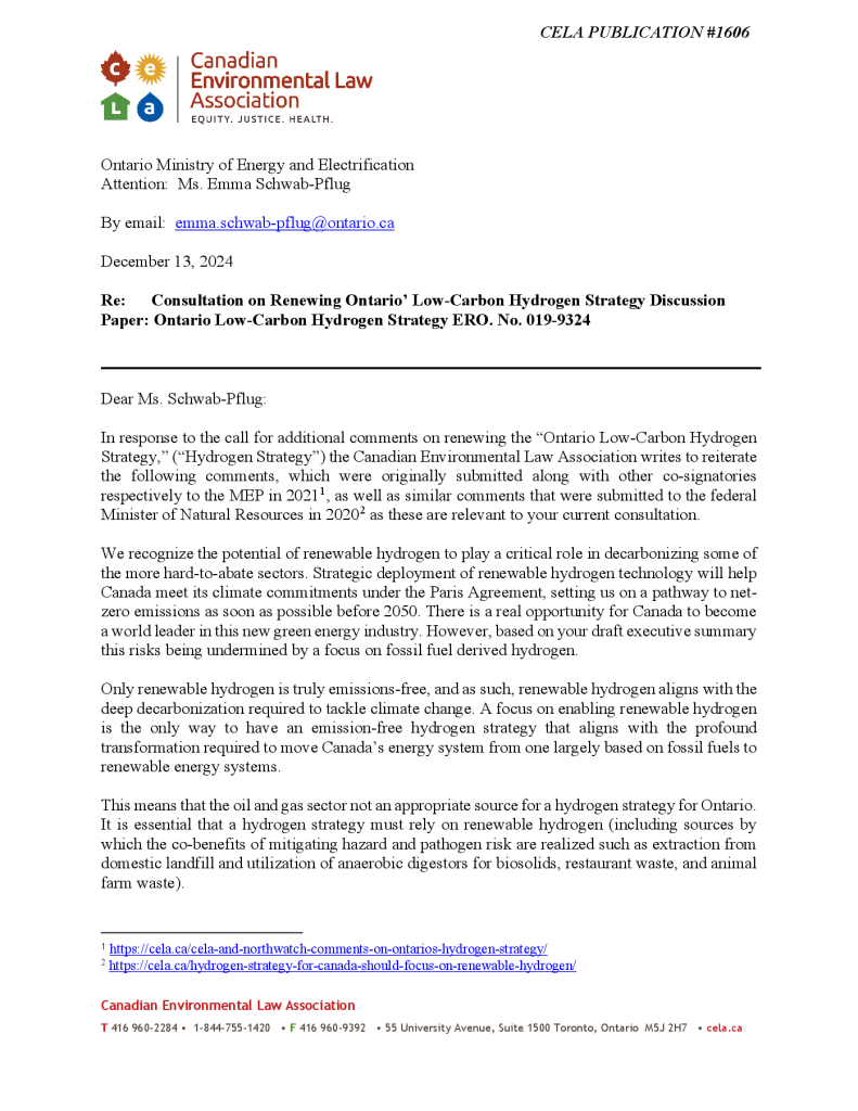 Submission: CELA Comments on ERO Posting # 019-9324 Re: Consultation on Renewing Ontario’s Low-Carbon Hydrogen Strategy Discussion
