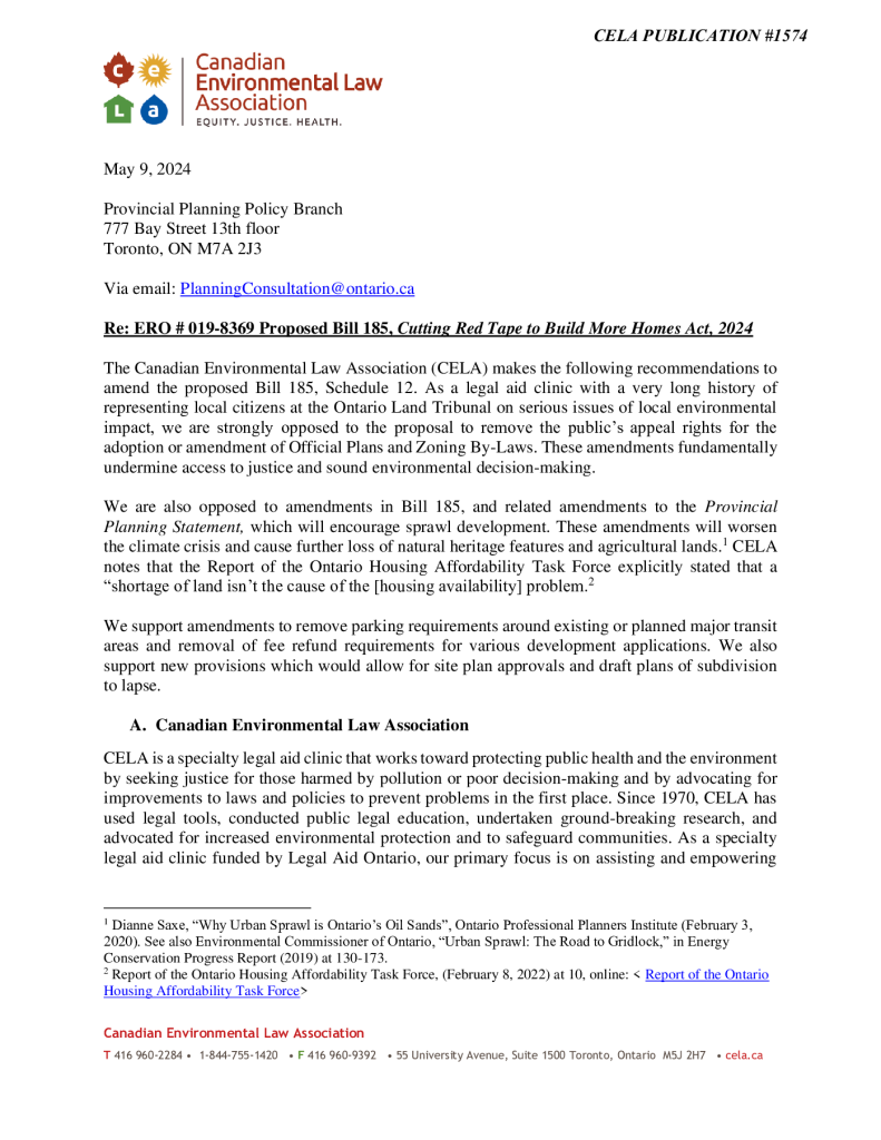 Submission: CELA Comments on Proposed Bill 185, Cutting Red Tape to Build More Homes Act, 2024, ERO # 019-8369