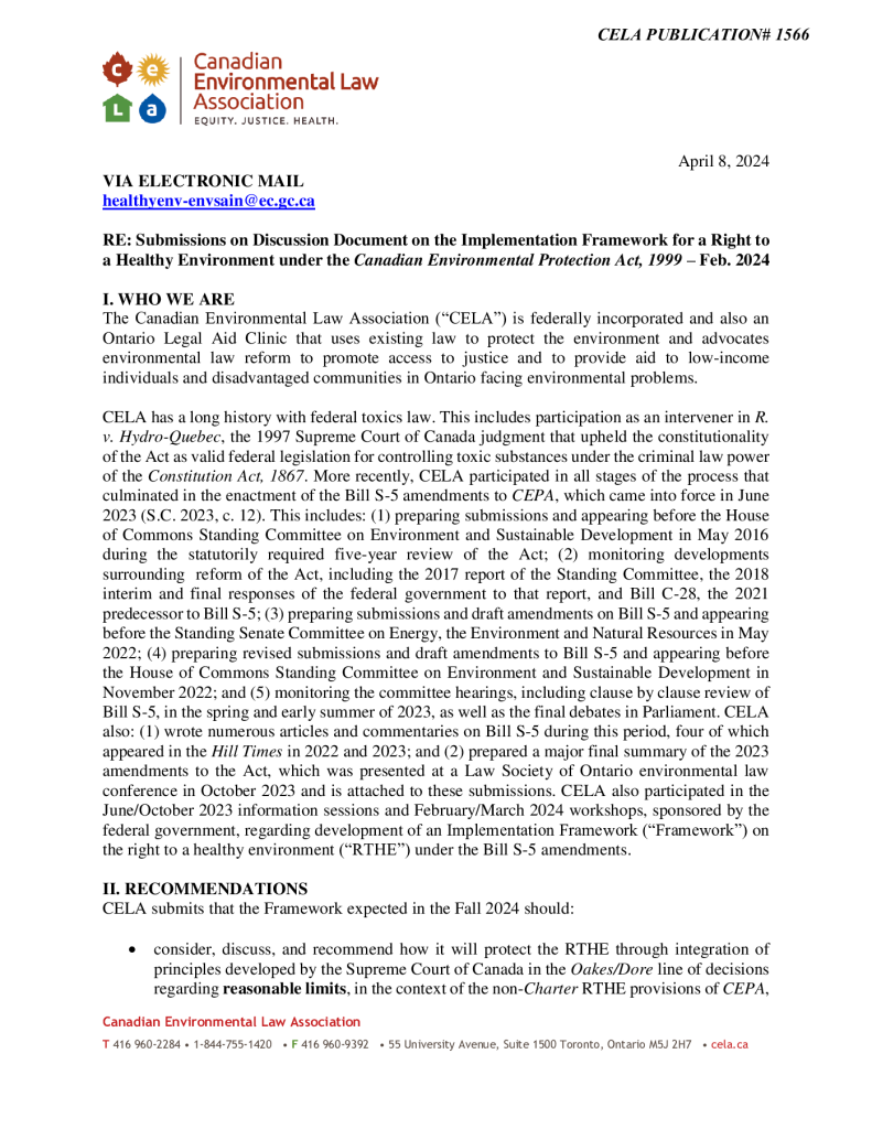 Submission: CELA Comments on the Discussion Document on the Implementation Framework for a Right to a Healthy Environment under the Canadian Environmental Protection Act, 1999