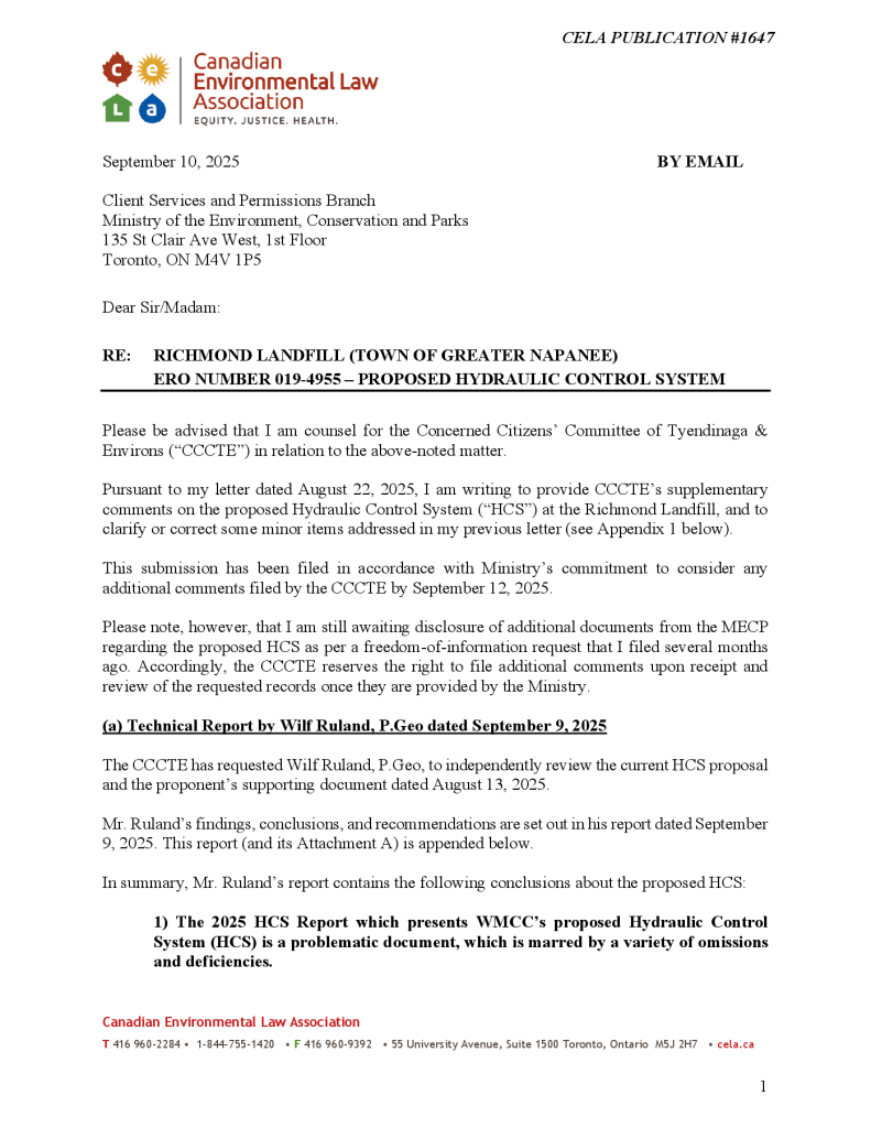 Submission: CELA Letter to MECP re: ERO # 019-4955 – Proposed Hydraulic Control System & Supplementary CCCTE Comments
