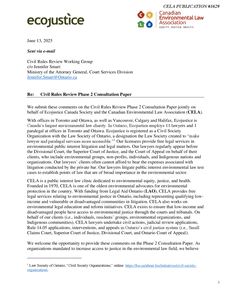 Submission: Ecojustice & CELA Comments on Civil Rules Review Phase 2 Consultation Paper