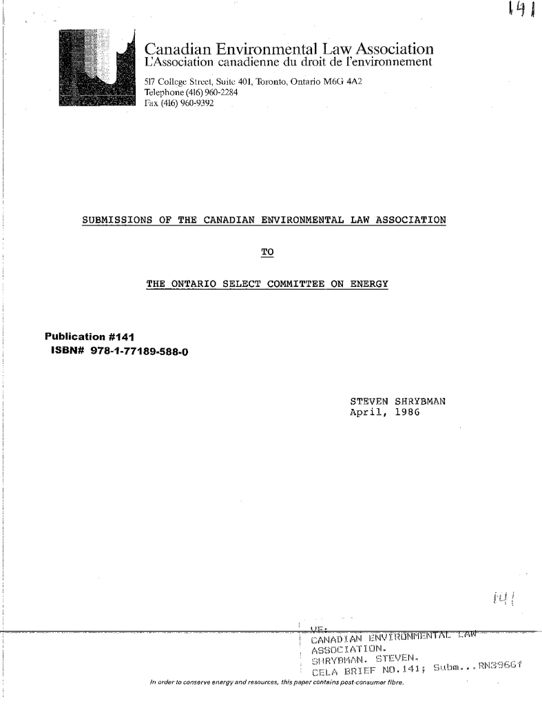 Submission of the Canadian Environmental Law Association to the Ontario Select Committee on Energy