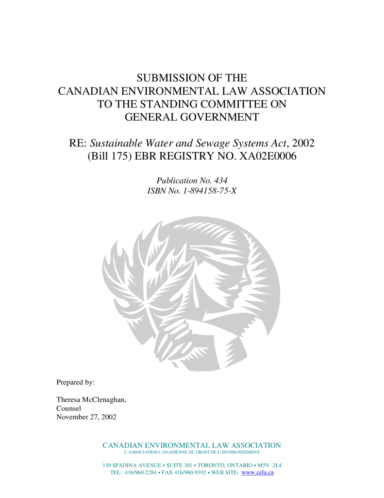Submission of the Canadian Environmental Law Association to the Standing Committee on General Government re: Sustainable Water and Sewage Systems Act, 2002 (Bill 175)