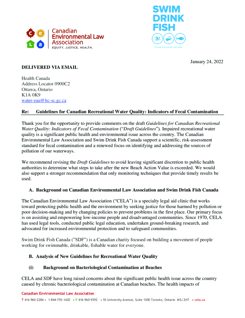Submission on Draft Guidelines for Canadian Recreational Water Quality