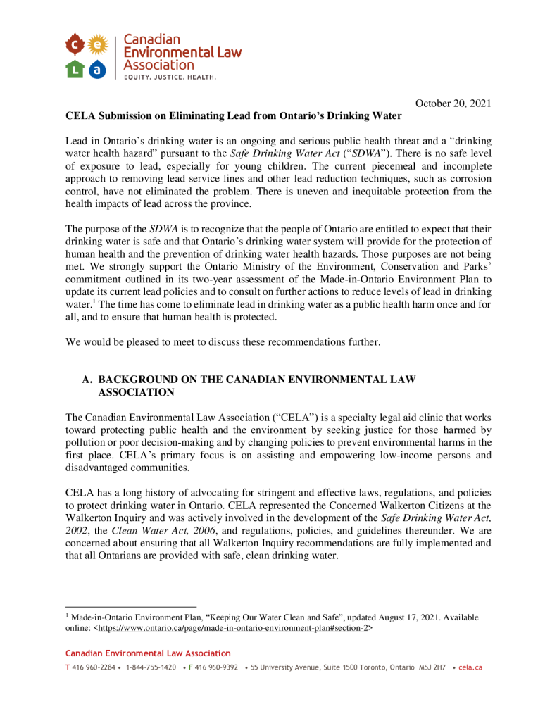 Submission on Eliminating Lead from Ontario’s Drinking Water