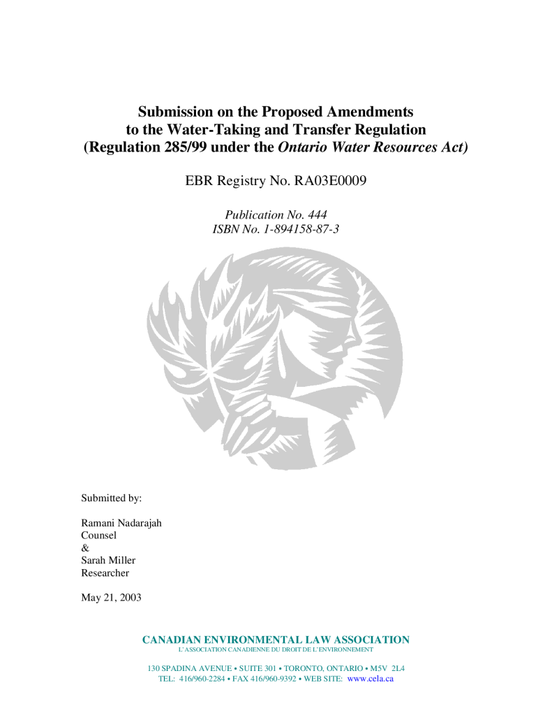 Submission on the proposed amendments to the Water-Taking and Transfer Regulation (Regulation 285/99 under the Ontario Water Resources Act)
